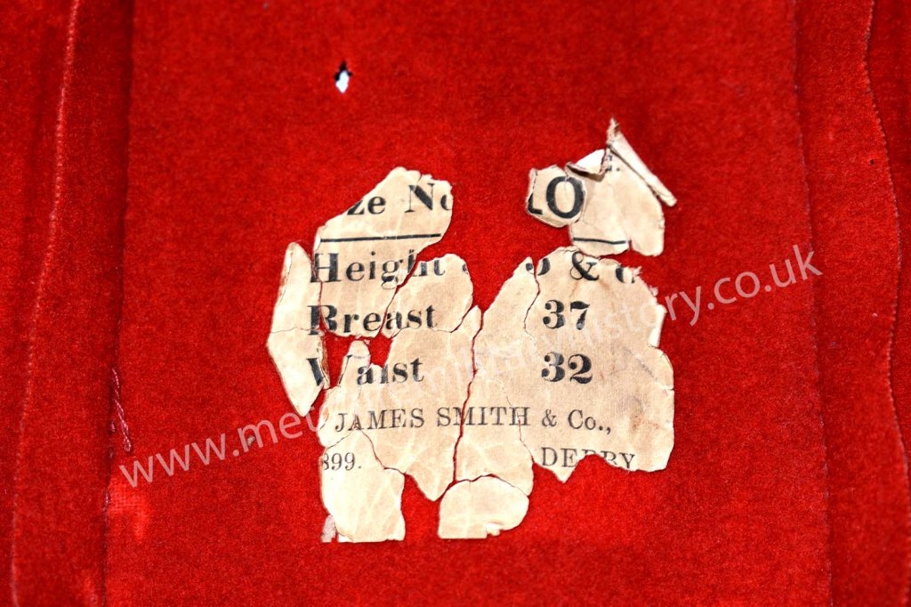 Amazingly, the manufacturer’s paper label is still present and shows this tunic was made by James Smith & Co of Derby in 1899. The company had been established in 1860, and were still manufacturing military clothing into the 1970s.