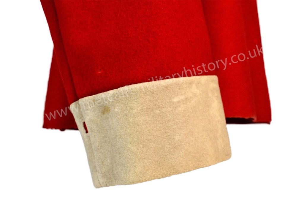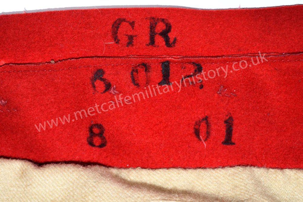 This pattern tunic was introduced in 1881 and worn up until around 1902. The white facings (collar and cuffs) denote its use by a non-royal regiment. Despite being issued in huge quantities over this period, they are now quite difficult to find on the open market. Sadly, the embroidered shoulder straps are missing. This is commonplace with these tunics, as dealers and collectors have been known to remove these to collect them individually, or sell them on as helmet flashes. I believe at one point, they were more valuable than the tunics themselves!