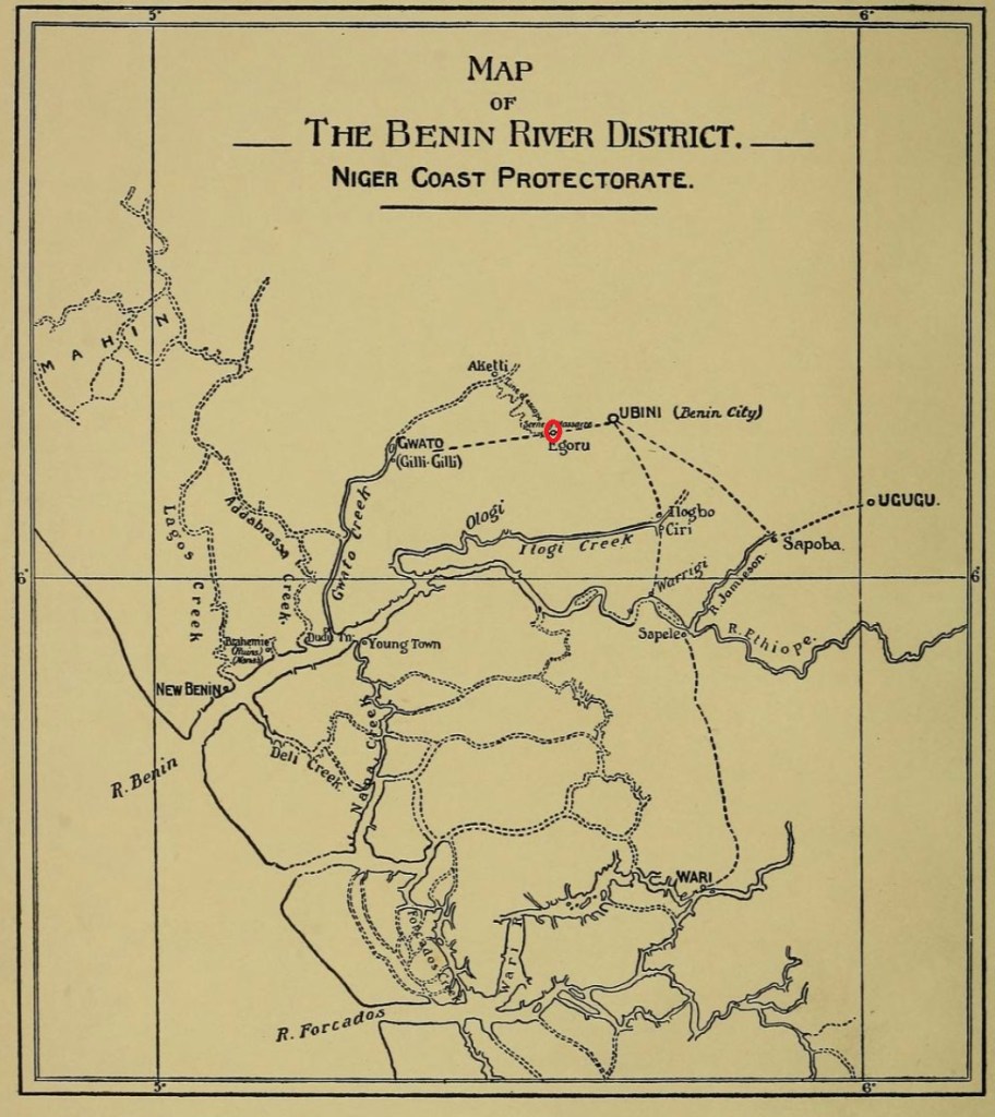 “On one of these expeditions Major Crawford and Captain Maling landed at Gwatto with a detachment of twenty soldiers and some Jakri carriers. The white men and the soldiers were allowed to come into the town, but any wretched Jakri who showed himself was chased by the Benin City men, and hunted back to the waterside again.”