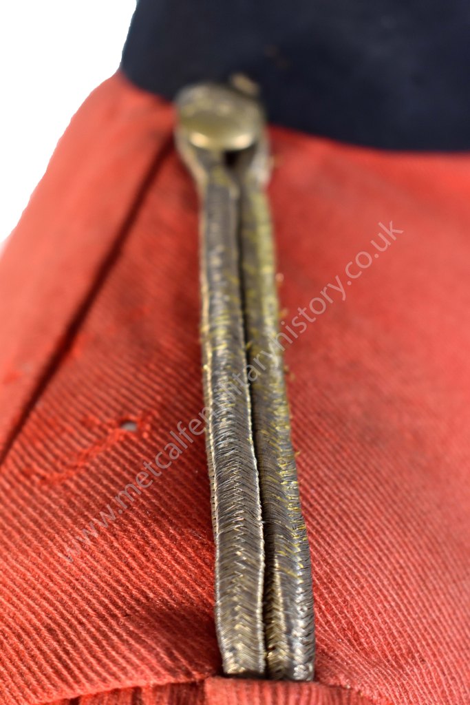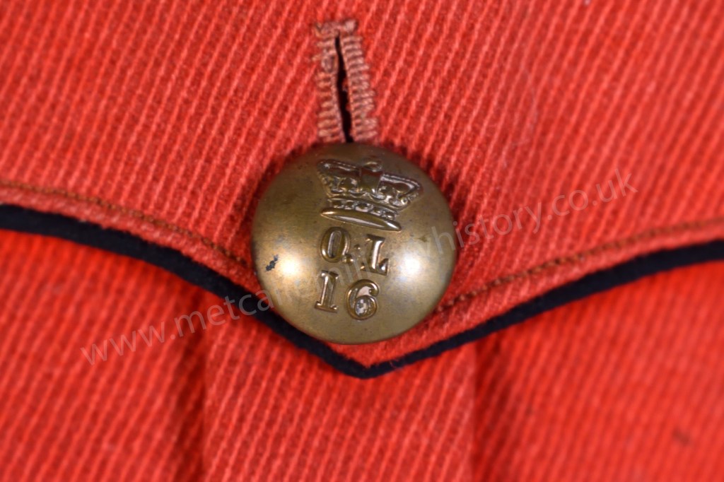 The Frock was designed to be worn in the field and on campaign, as an alternative to the more elaborate tunics usually sported by the Cavalry. These differed slightly from regiment to regiment, as each made small changes to customise them into a regimental pattern. This particular example to the 16th (The Queen’s) Lancers has the standard 16th Lancers regimental buttons, but the addition of blue piping to the arms, front seam and the rear. Instead of shoulder straps, a golden cord strap is used and blue pointed cuffs and collar have also been adopted. This is a very rare surviving example.
